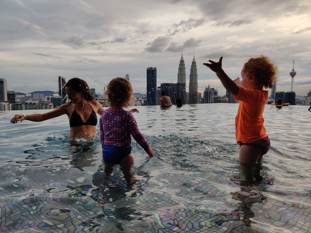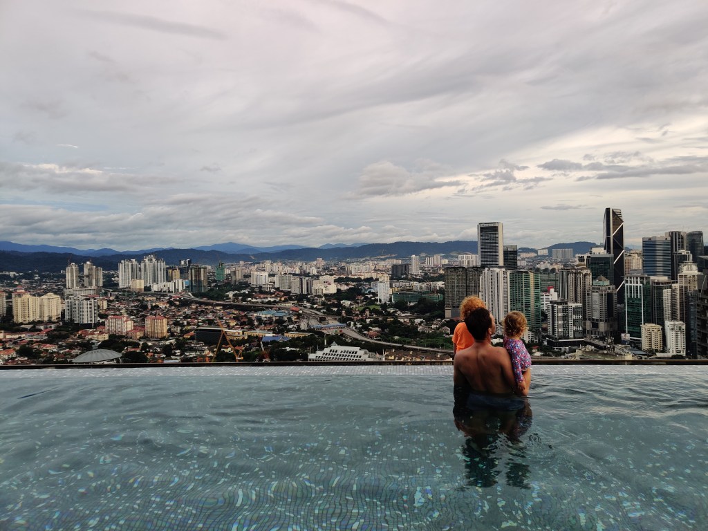 Padnięci po dniu, w którym nie zrobiliśmy nic oprócz nieudolnej próby zobaczenia miasta, kolejnego dnia zostajemy w hotelu. Stąd w sumie widać lepiej centrum niż kiedy jesteśmy pod wieżami. Kuala Lumpur nie jest przyjazne pieszym a już tym bardziej pieszym z wózkami. Kolejny dzień to relaks w basenie, siłownia i lokalne jedzonko. Pora monsunowa i logistyka przejścia z wózkami nas pokonały.