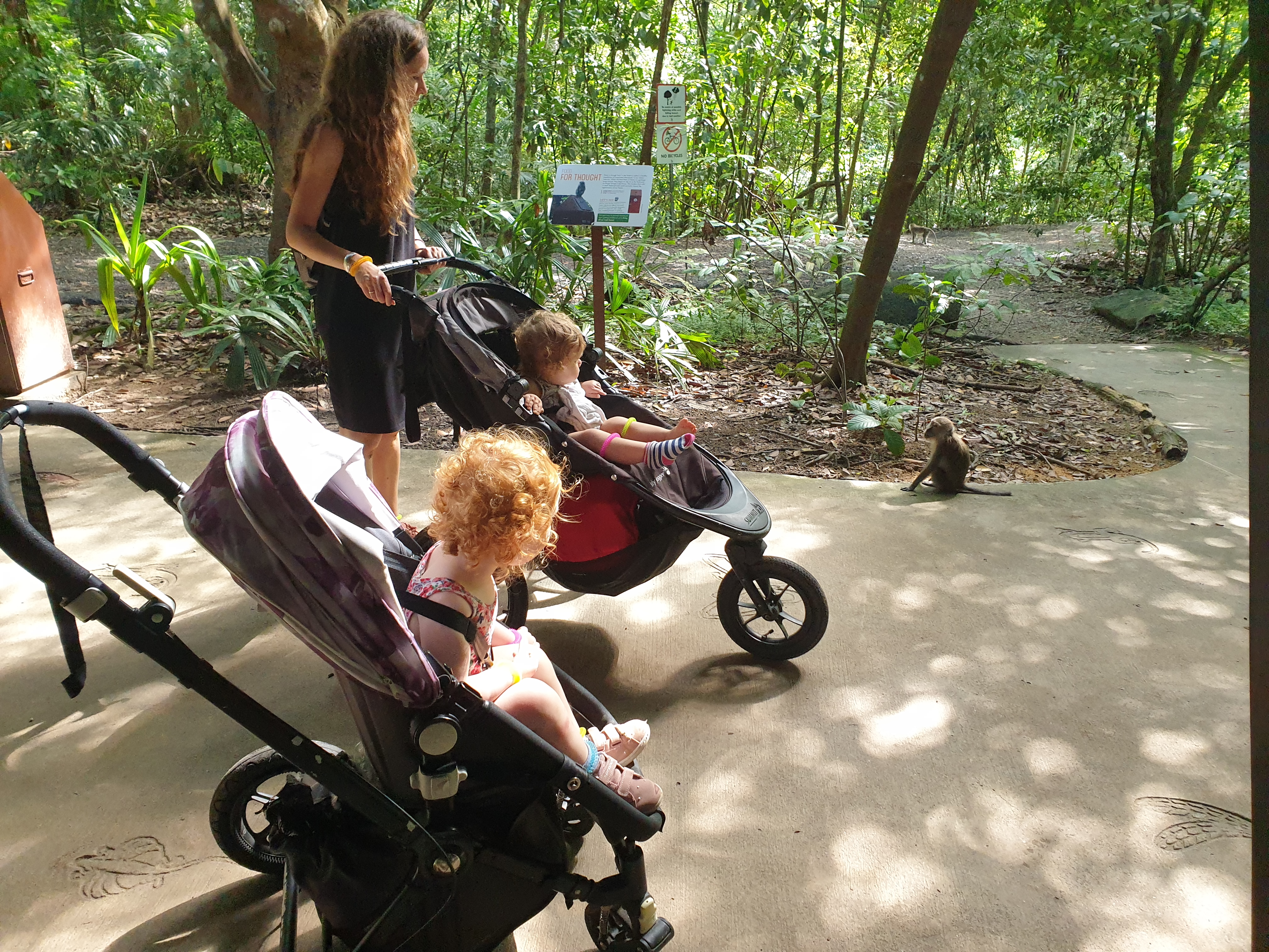 Zatrzymujemy się w małym domku przy szkółce bokserskiej. Z trenerem umawiamy się na kolejny dzień. Boksujemy, kopiemy, uczymy się uników. Po półtorej godziny treningu czuję się jakbym wskoczyła do wanny z gorącą wodą. Było świetnie. Niedaleko od szkółki jest wodospad. Nad wodospadem biegają małpy. Wracając zachodzimy do farmy zobaczyć jak rosną lokalne owoce. Niestety to nie sezon na duriany ale oglądamy ogromne Jack Fruits (chlebowce), winter melons, ananasy, orzeszki cashew i wiele innych. Młodsza Mała karmi sumy, my zajadamy się żółtym arbuzem. Jedziemy też zobaczyć karmienie krokodyli w lokalnej farmie. Młodszej Małej podobają się małe krokodyle. Na mnie największe wrażenie robi ociężały ponad 4 metrowy olbrzym.