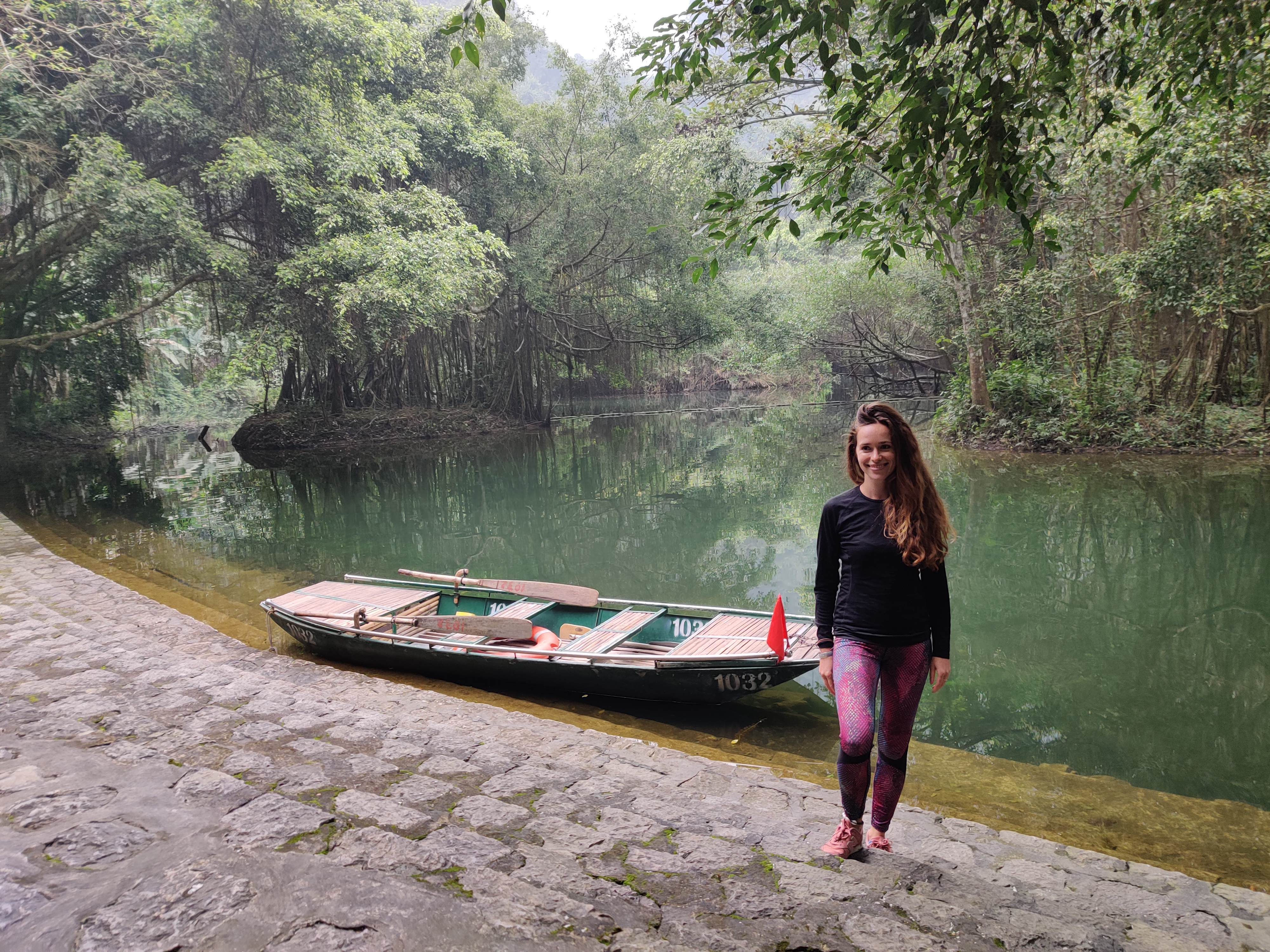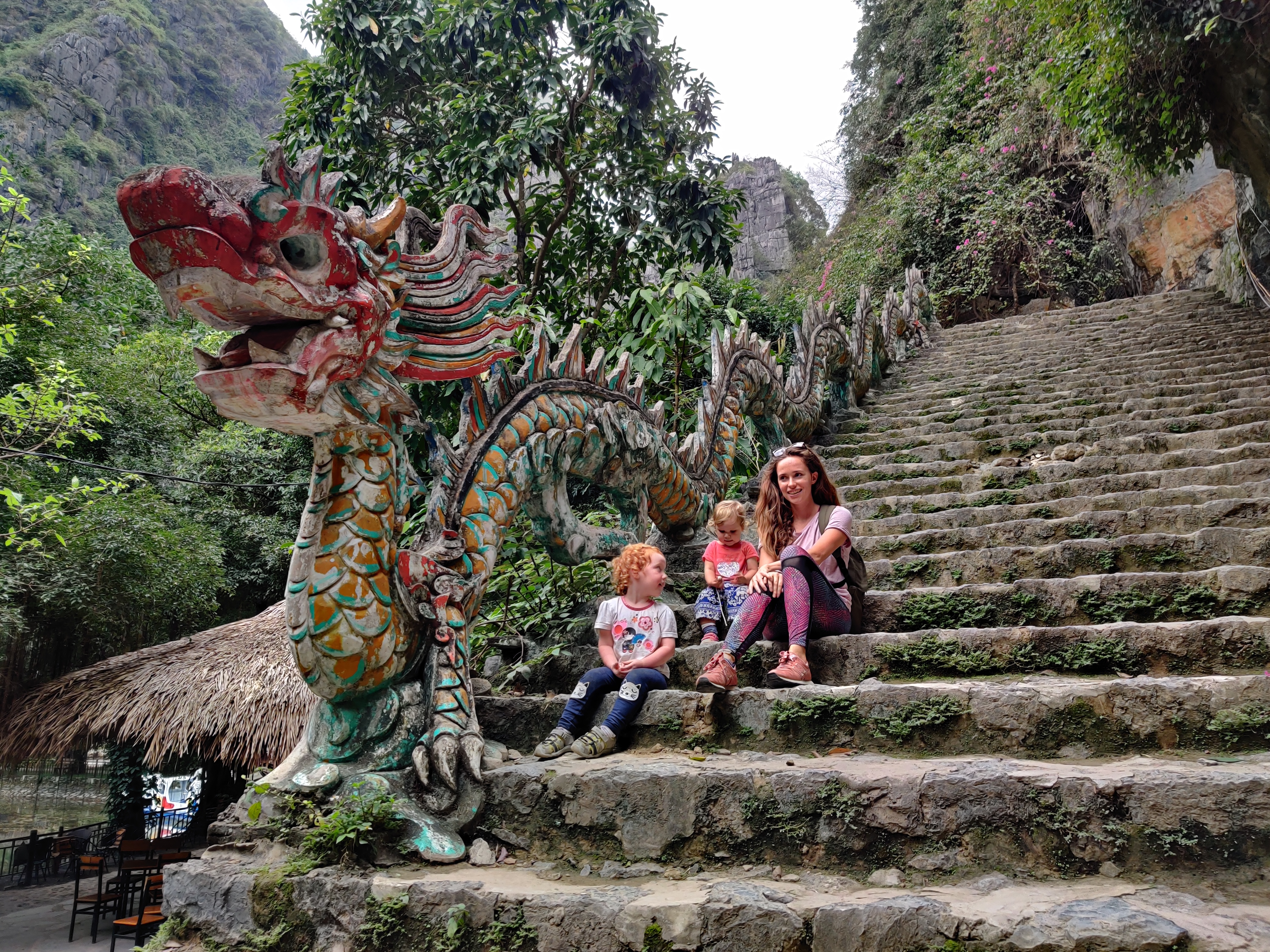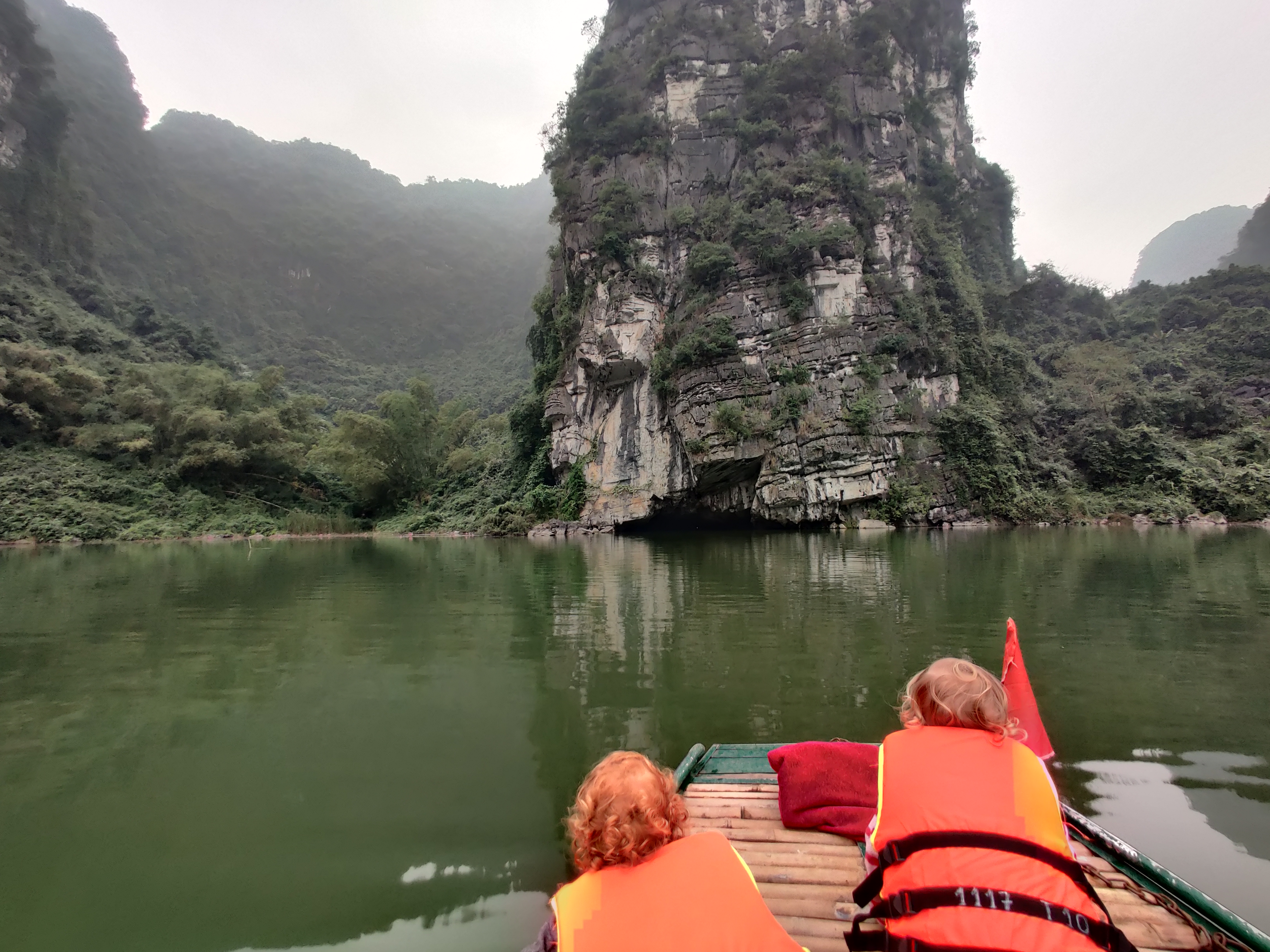 W Trang An wsiadamy w malutką łódkę. Zakładamy kamizelki. Na zmianę wiosłujemy i pilnujemy Młodszych Małych. Płyniemy pomiędzy górami, przepływamy przez jaskinie. Najdłuższa z nich ma około 600 metrów. Raz po raz kładziemy się, żeby nie uderzyć głową w stalaktyty. Trasa łódki meandruje przez wykute w skale tunele, prowadzi pomiędzy zielonymi zboczami gór. Otacza nas cisza (przerywana piszczeniem fletu). Koniec stycznia to niski sezon. W czasie 3 godzinnej wycieczki mijamy się z kilkoma innymi łodziami. Po drodze oglądamy świątynie, wspinamy się na punkt widokowy, kupujemy flet, na którym Młodsza Mała zawzięcie gra przez resztę trasy. Pod koniec wyprawy dziewczyny zasypiają. Otwieramy piwo. Nasz przewodnik zapala fajkę zrobioną z bambusa. Jemy bananowo kokosowe żelki. Ich smaku będzie mi brakować. Wracamy do parkingu po skuter. Podobno czasami przewodnicy wiosłują nogami. Podobno tak łatwiej. Nasz wiosłuje normalnie, nieprzerwanie, przez kilka godzin. Z małą pomocą nas – rodziców, raz po raz rzucających wiosło i pokrzykujących ‘uważaj, bo będzie bam!’