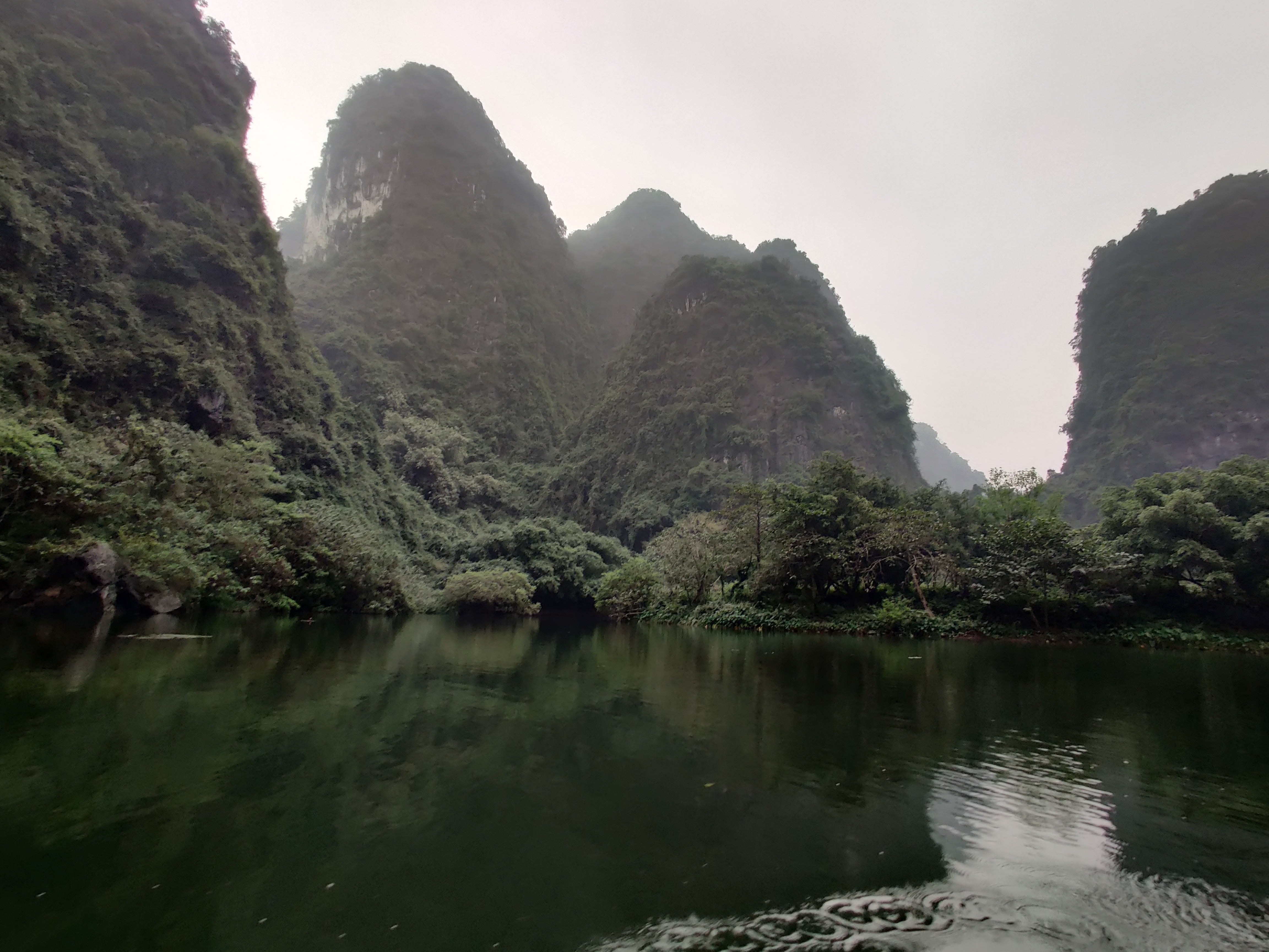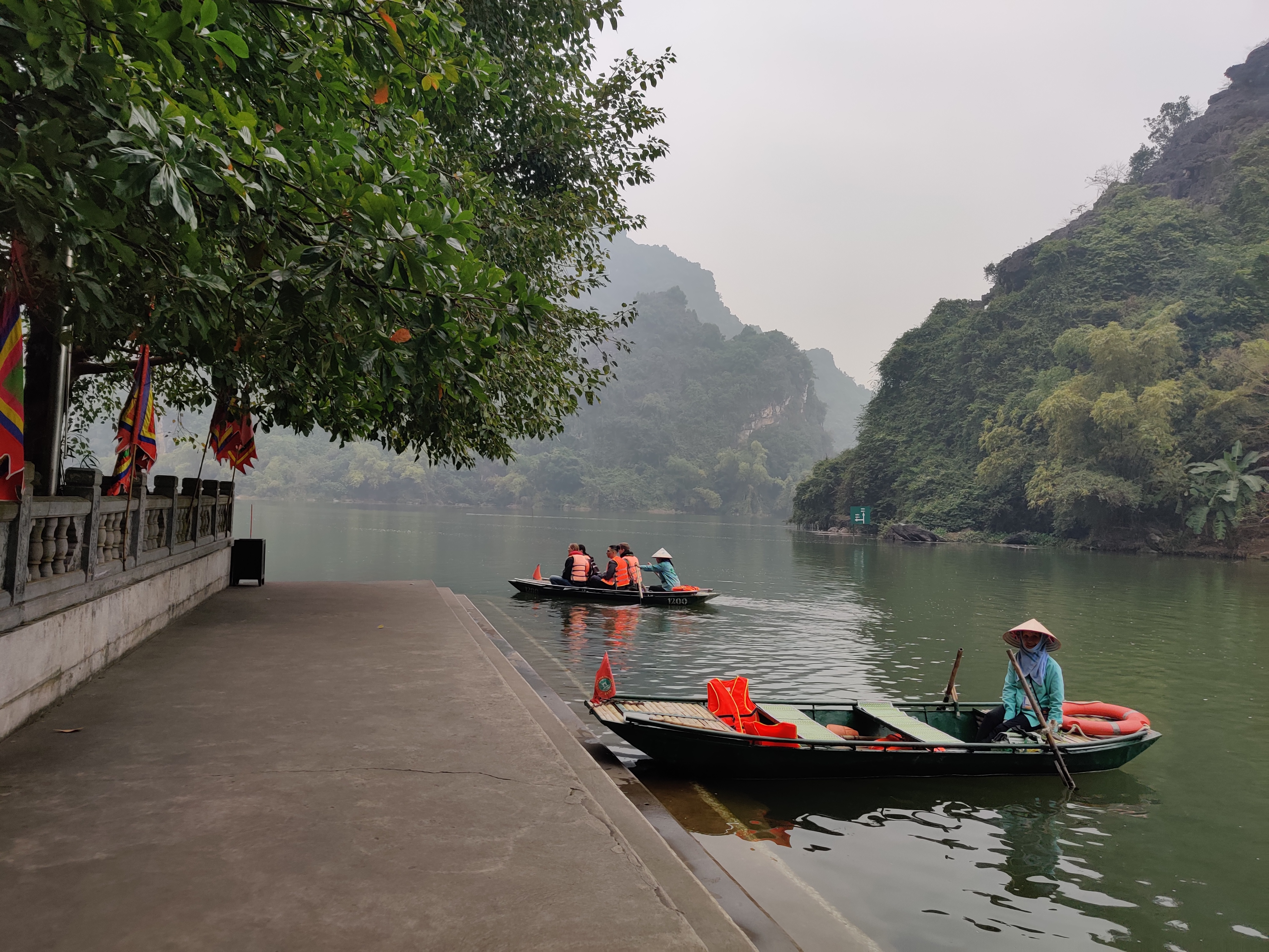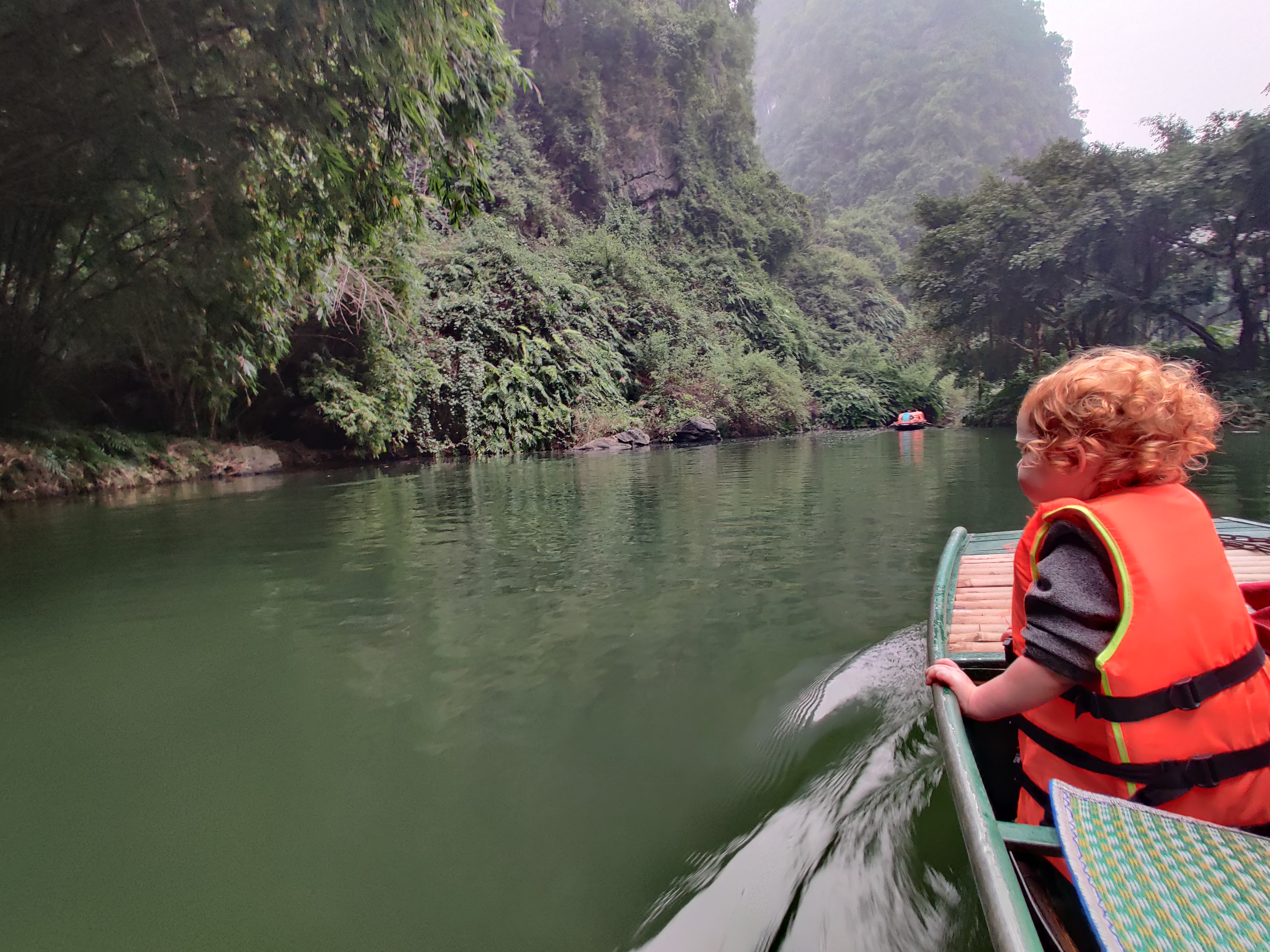 W Trang An wsiadamy w malutką łódkę. Zakładamy kamizelki. Na zmianę wiosłujemy i pilnujemy Młodszych Małych. Płyniemy pomiędzy górami, przepływamy przez jaskinie. Najdłuższa z nich ma około 600 metrów. Raz po raz kładziemy się, żeby nie uderzyć głową w stalaktyty. Trasa łódki meandruje przez wykute w skale tunele, prowadzi pomiędzy zielonymi zboczami gór. Otacza nas cisza (przerywana piszczeniem fletu). Koniec stycznia to niski sezon. W czasie 3 godzinnej wycieczki mijamy się z kilkoma innymi łodziami. Po drodze oglądamy świątynie, wspinamy się na punkt widokowy, kupujemy flet, na którym Młodsza Mała zawzięcie gra przez resztę trasy. Pod koniec wyprawy dziewczyny zasypiają. Otwieramy piwo. Nasz przewodnik zapala fajkę zrobioną z bambusa. Jemy bananowo kokosowe żelki. Ich smaku będzie mi brakować. Wracamy do parkingu po skuter. Podobno czasami przewodnicy wiosłują nogami. Podobno tak łatwiej. Nasz wiosłuje normalnie, nieprzerwanie, przez kilka godzin. Z małą pomocą nas – rodziców, raz po raz rzucających wiosło i pokrzykujących ‘uważaj, bo będzie bam!’