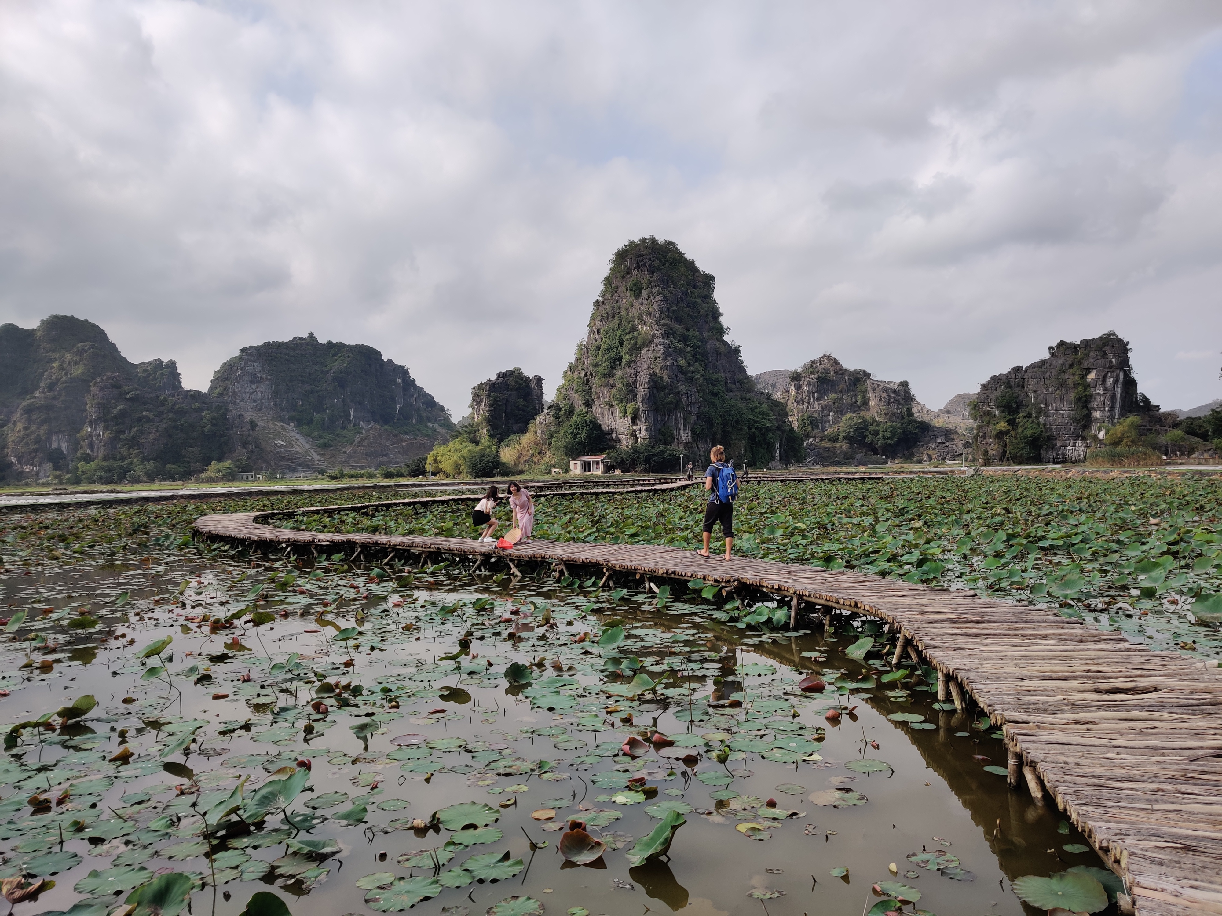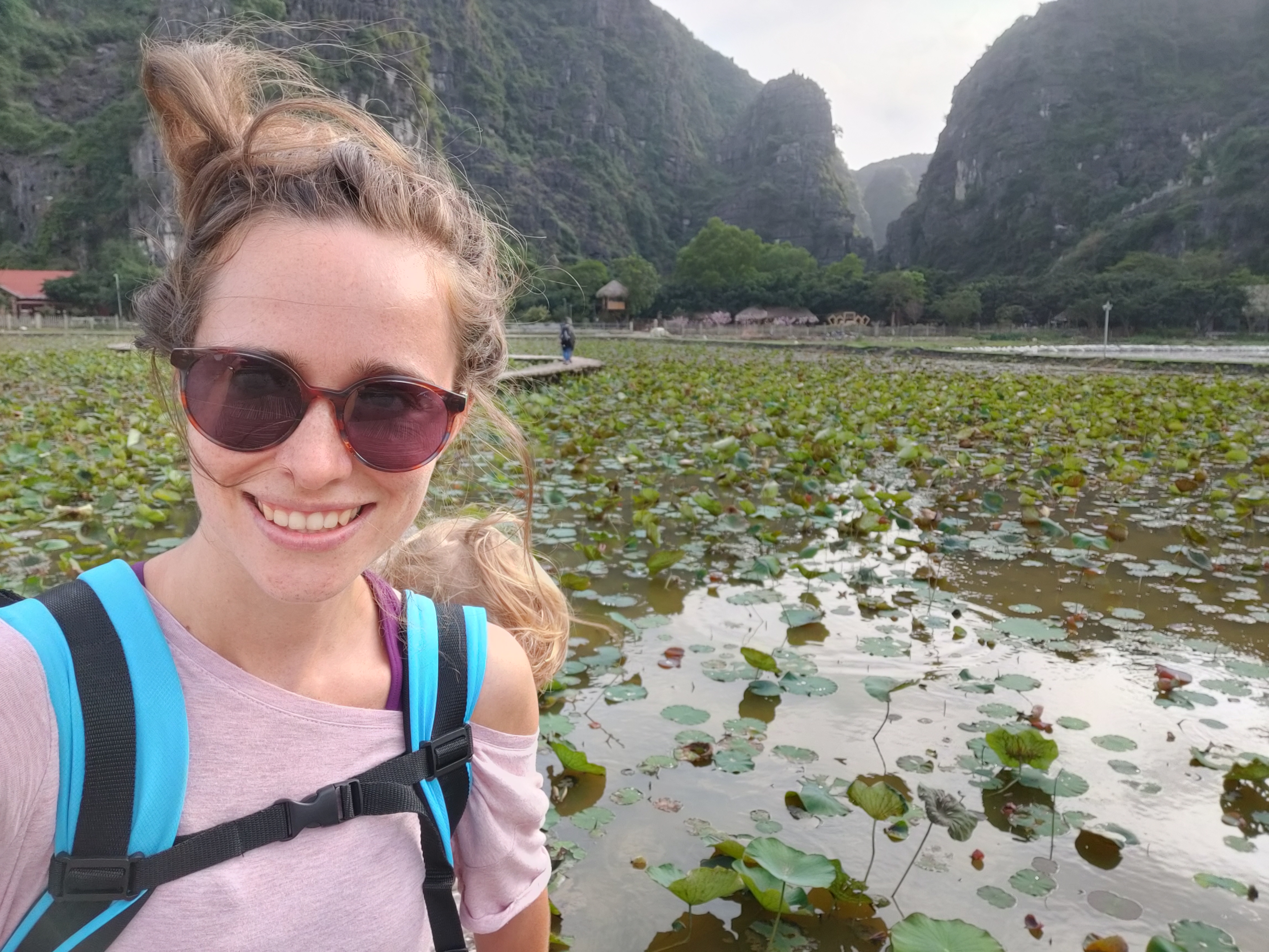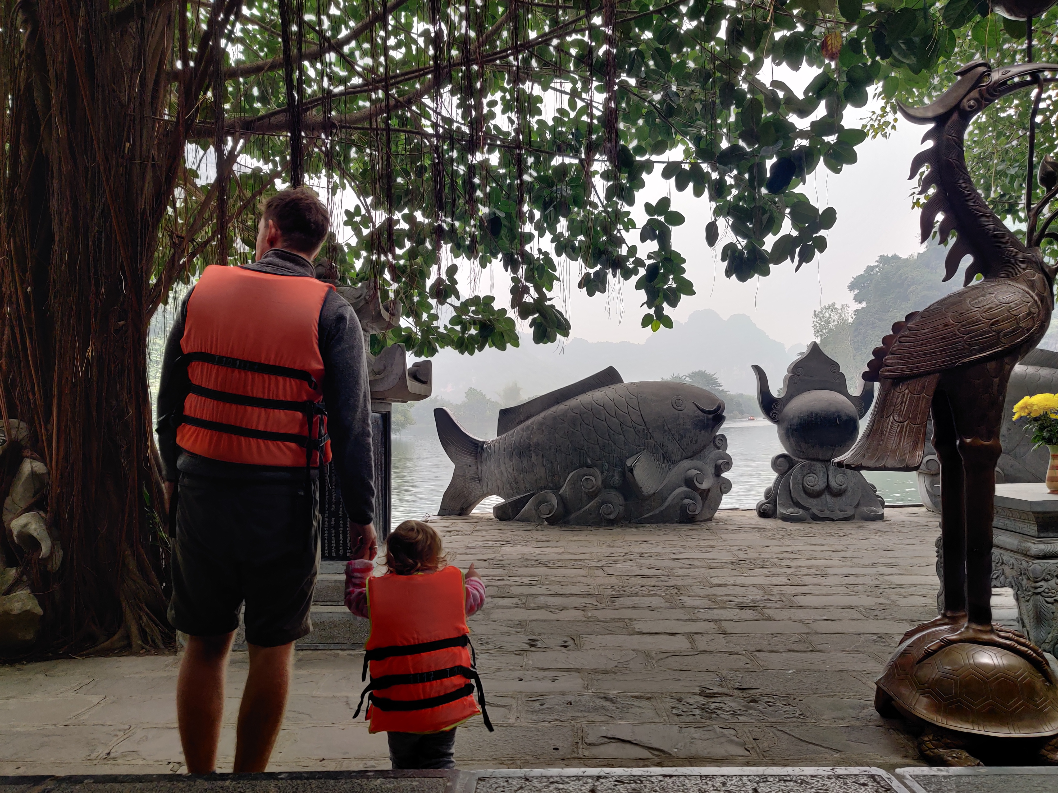 Kolejnego dnia ruszamy wspiąć się na Hang Mua Peak. Trasa tam to koszmar ciągnący się wzdłuż głównej drogi, na której skuter dla kierowców autobusów i ciężarówek jest najprawdopodobniej niewidzialny. Wracamy piękną, spokojną, równoległą trasą. Na Hang Mua prowadzi 500 stromych schodów. Pakuję Najmniejszą Małą w nosidło i idziemy. Grubego męczy przeziębienie więc ma iść z Mniejszą Małą tyle ile ona sama da radę. Weszła praktycznie na sam szczyt. Mój zuch! Z góry roztacza się widok na dolinę Tam Coc. Doliną meandruje rzeka, którą spływają łódeczki z turystami. Są pola ryżowe, otoczone przez zielone szczyty. Jest pięknie. Wracając idę pomostem przez jezioro lotosów. Młodszej Małej obiecujemy lody. Rzadna z tutejszych restauracji ani sklepów nie jest czynna. Niski sezon i Tet sprawił, mała gastronomia chwilowo zamarła.